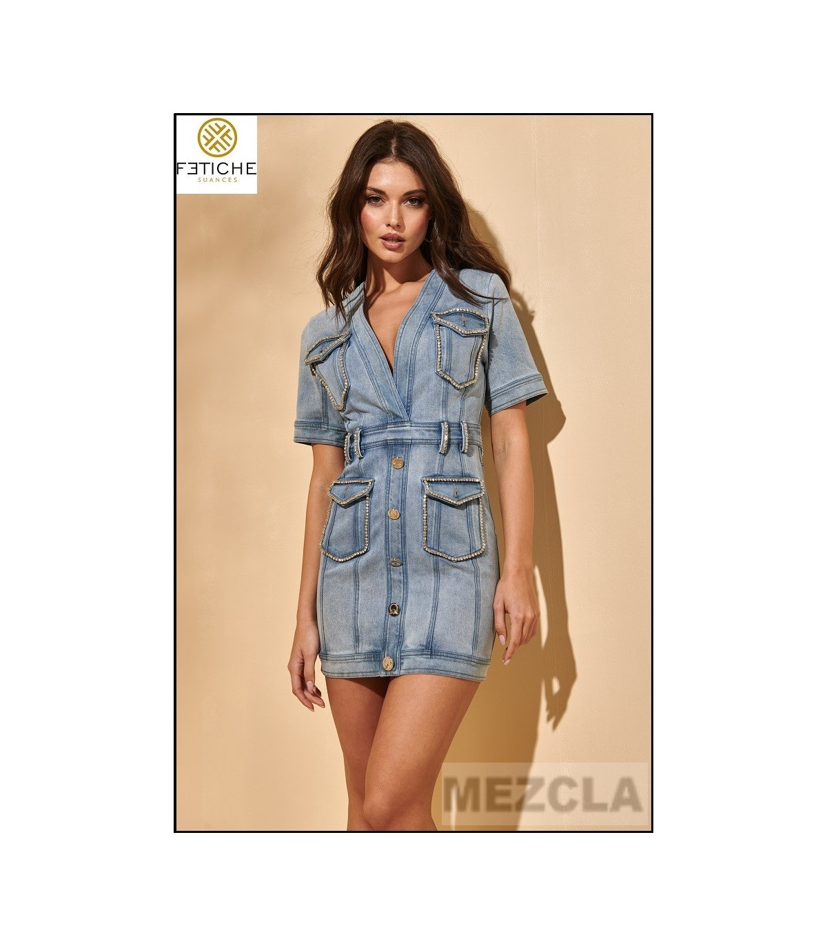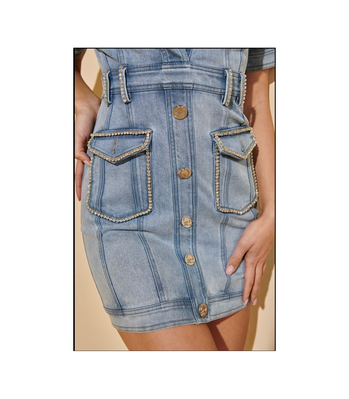 Un vestido vaquero que redefine el concepto de glam casual. El Mercy Denim Dress es puro espectáculo: entallado, con escote en pico, cierre de botones joya y detalles de pedrería que marcan la diferencia. Cada bolsillo, cada costura y cada hebilla brillan con luz propia, convirtiéndolo en una joya de denim que no pasa desapercibida.