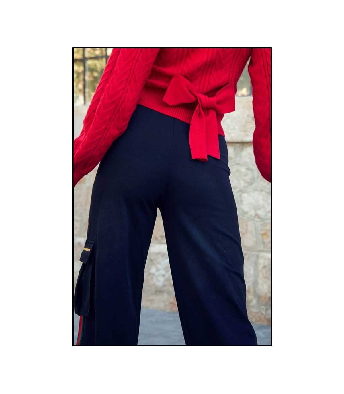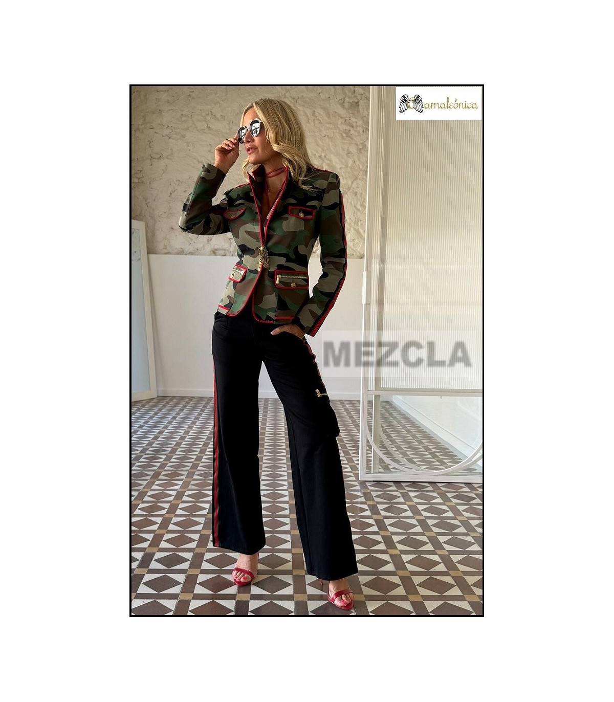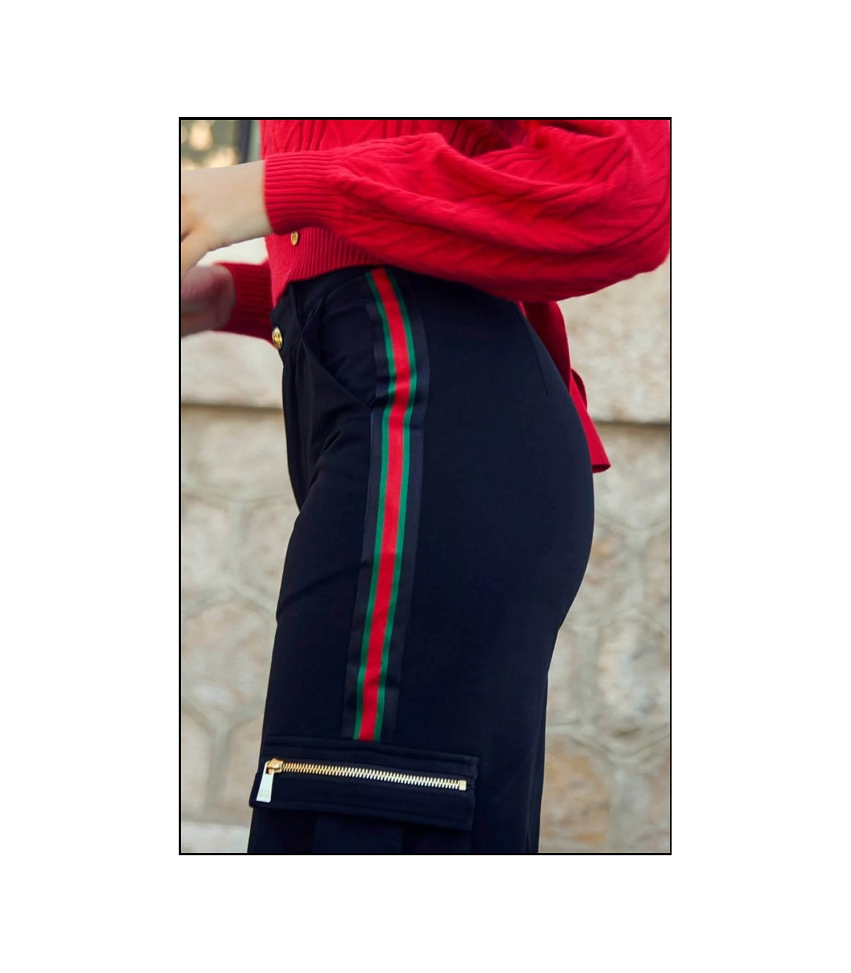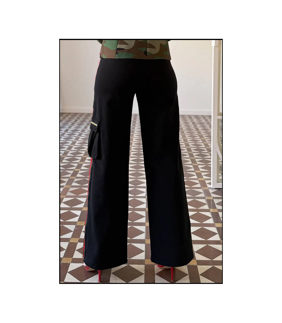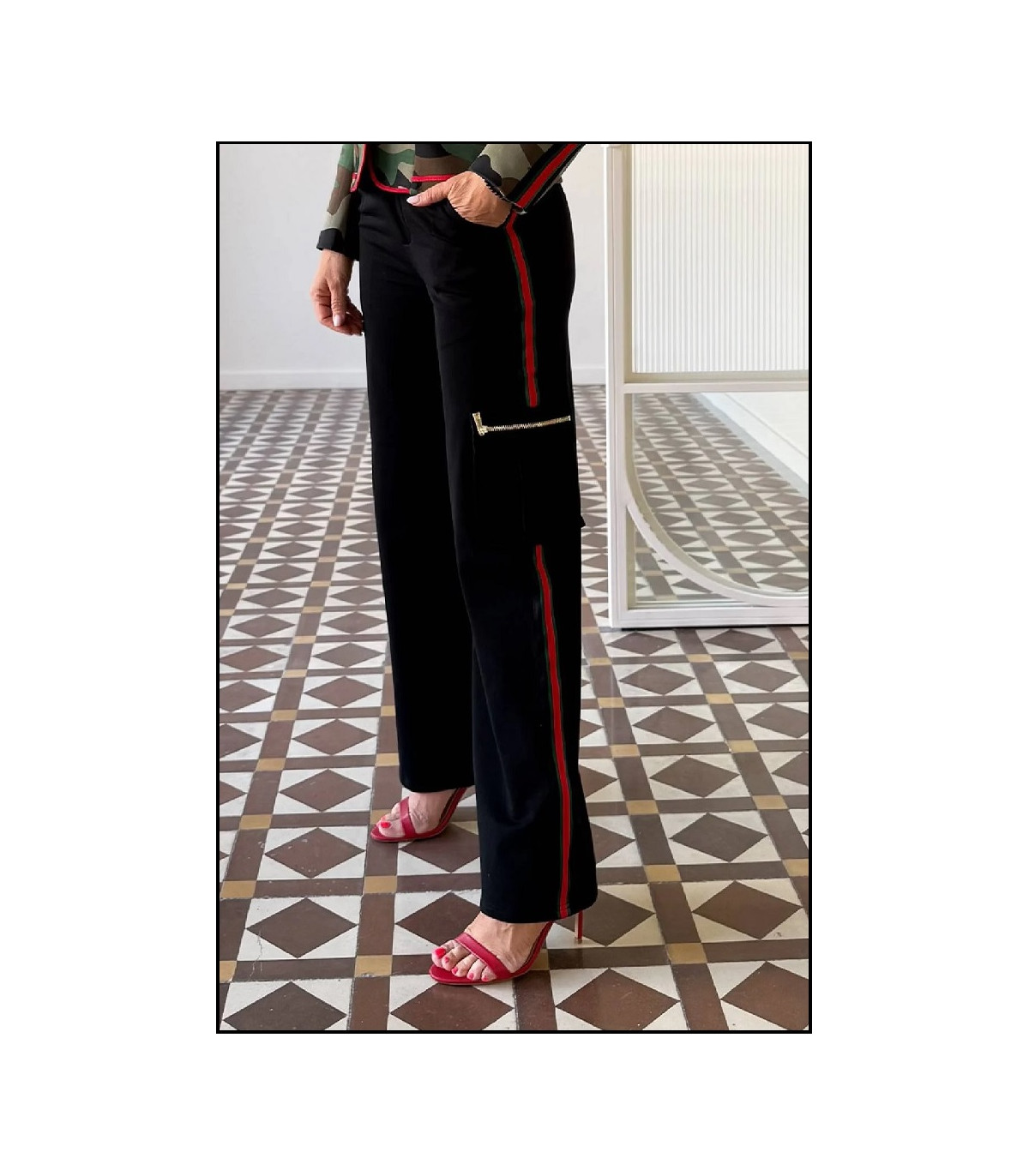 Pantalón cargo en color negro con franja lateral verde y roja. Bolsillos laterales con cremallera dorada. Doble bolsillo superior Se abrocha con botón y cremallera. Trabillas para cinturón.