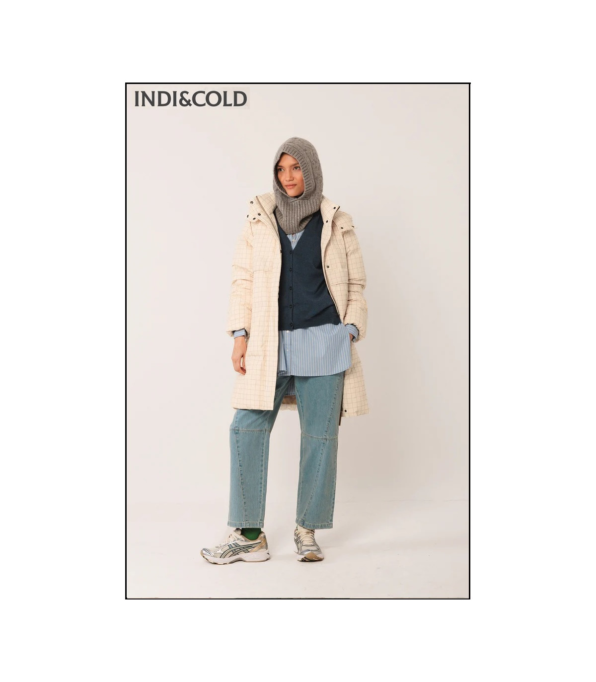 Capucha extraíble y ajustable • Cuello subido corte de manga ranglan • Cierre frontal de doble cremallera y tapeta con cierre de snaps • Tejido con print de cuadro y repelente al agua, no impermeable • Cintas interiores que permiten colgar el abrigo a los hombros • Bolsillos de de doble abertura.