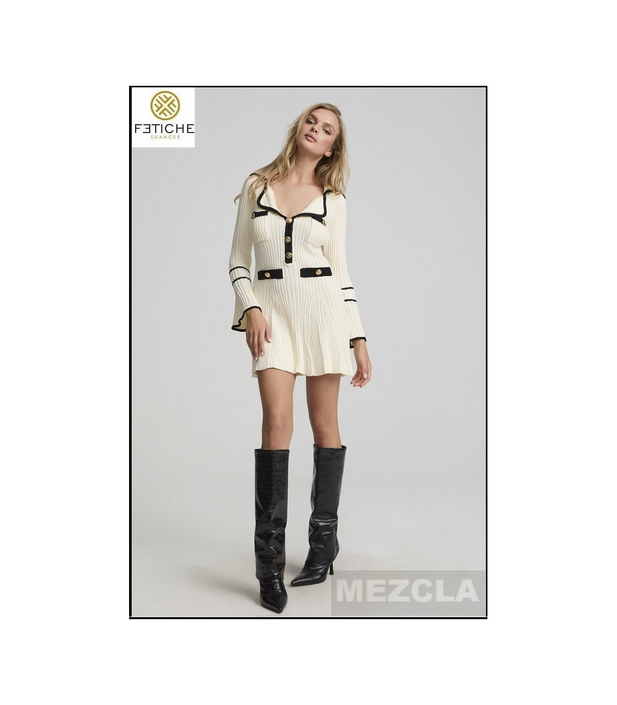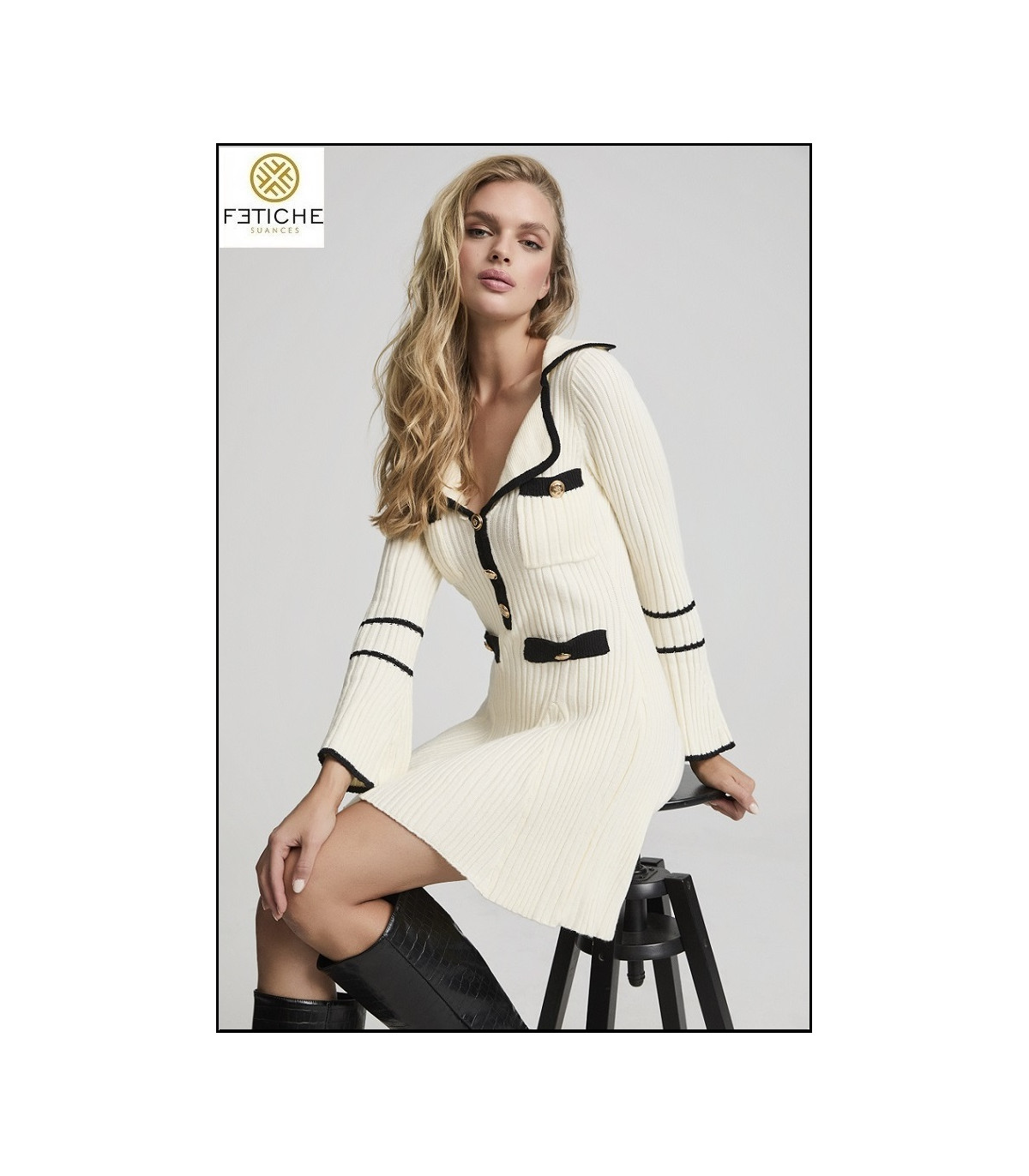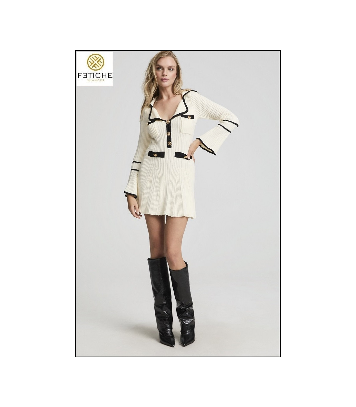 Elegancia atemporal con un aire moderno. Este vestido corto de punto en color marfil resalta por su silueta femenina y sus detalles en contraste negro que definen el escote, mangas y bolsillos falsos con delicados lazos. La botonadura frontal con botones dorados aporta un toque sofisticado y exclusivo.
