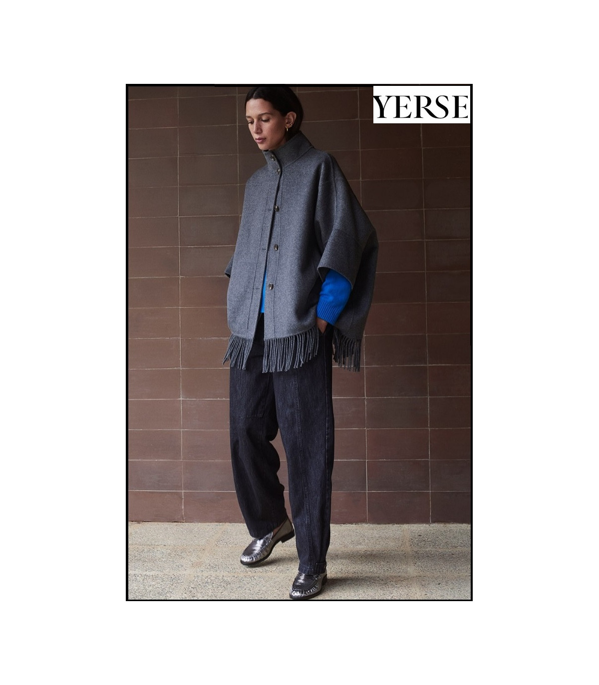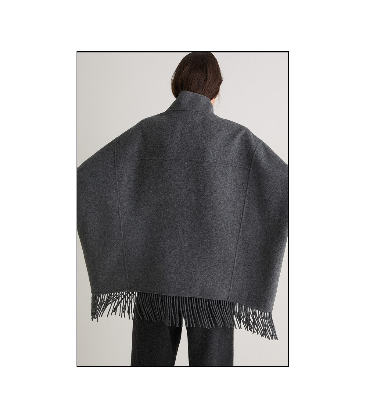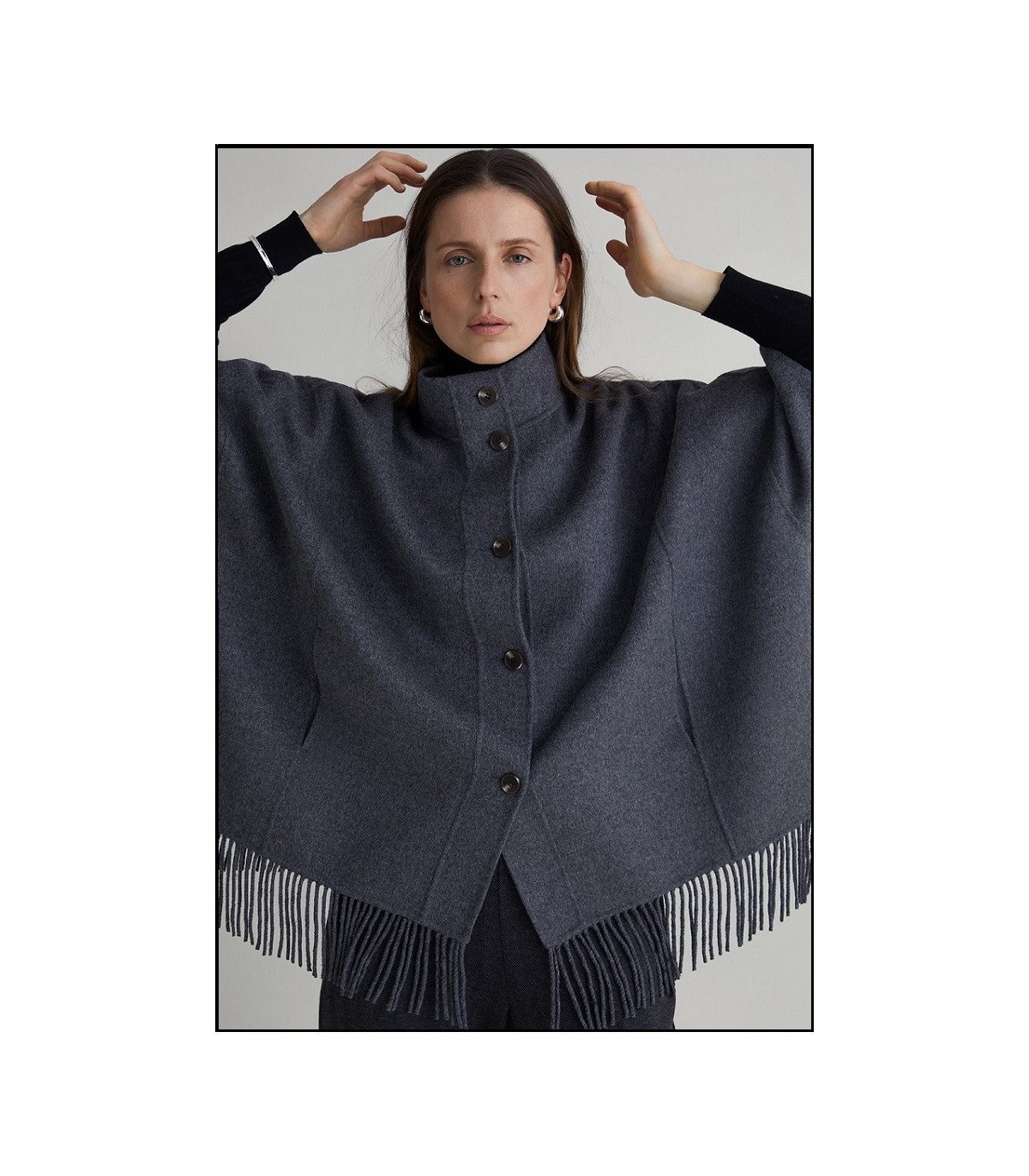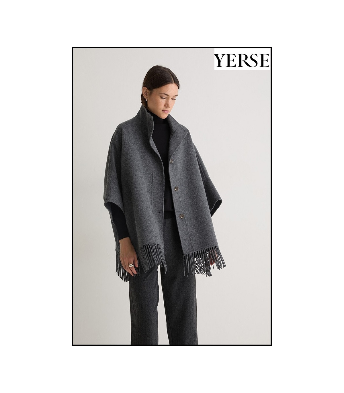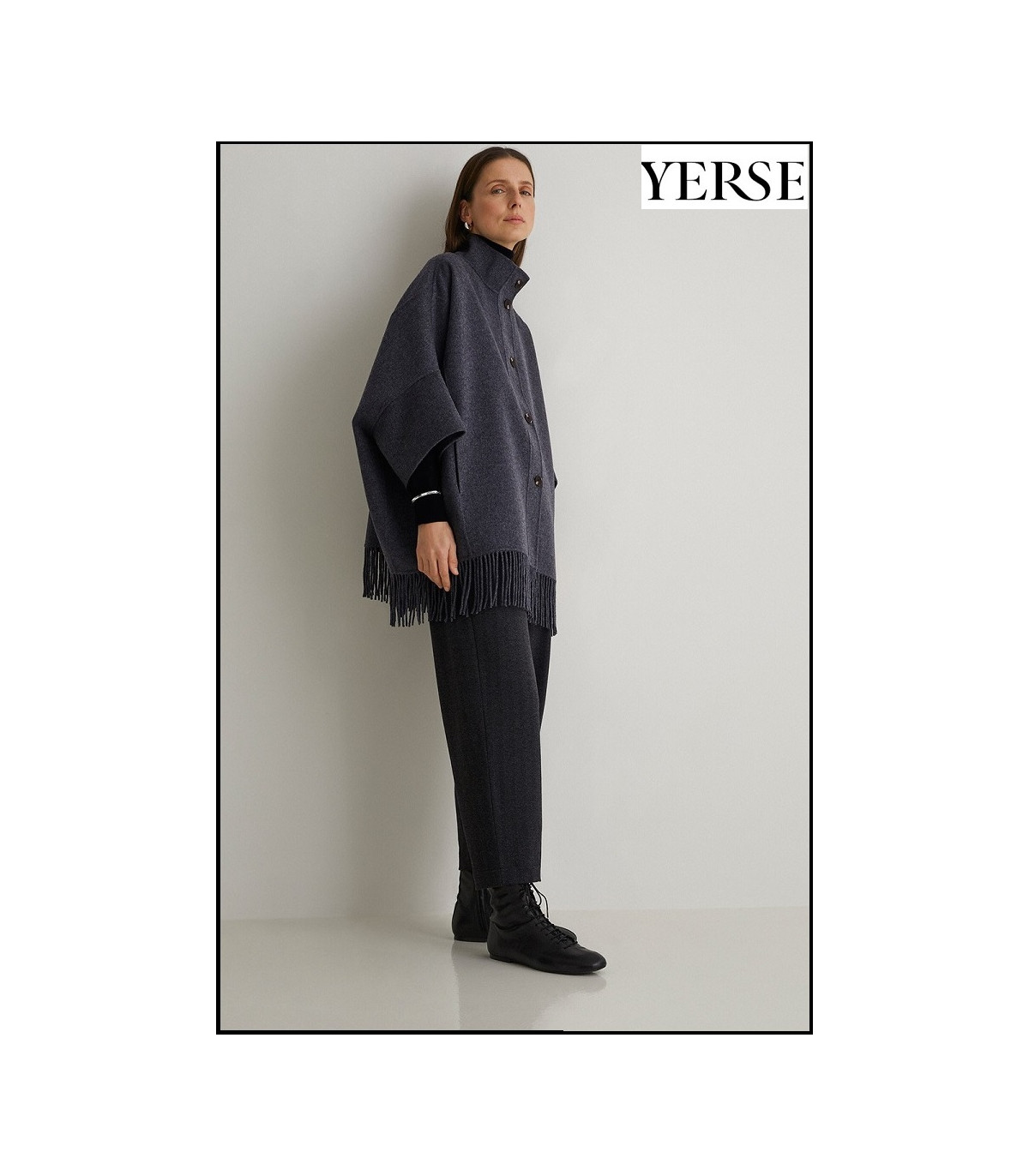 DETALLES: Tejido confeccionado con lana y fibras recicladas. Cuello subido. Manga 3/4. Cierre frontal con botones. Acabado con flecos. bolsillos laterales.