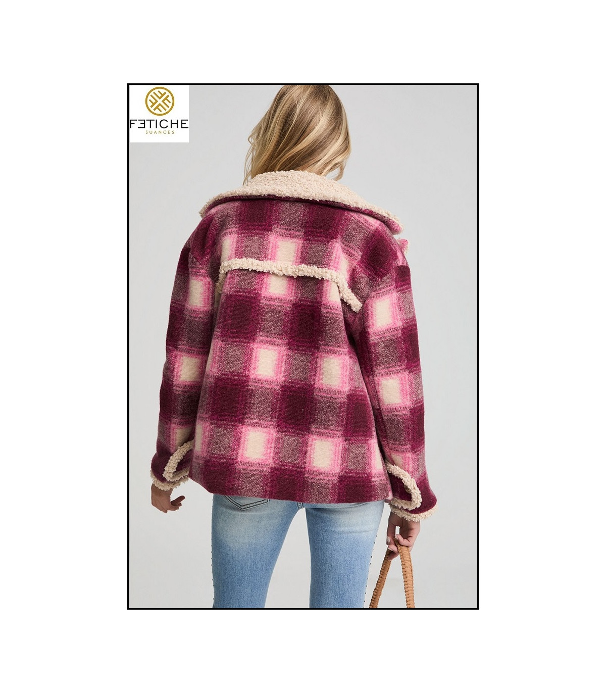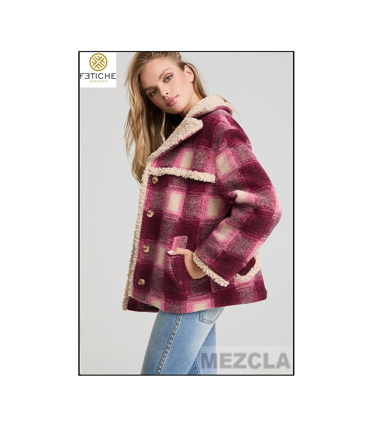 Esta prenda combina la calidez del tejido shearling con la elegancia del estampado tartán en tonos burdeos y rosa empolvado. Su silueta ligeramente oversize y su tacto suave aportan ese equilibrio perfecto entre abrigo y estilo, ideal para los días fríos.