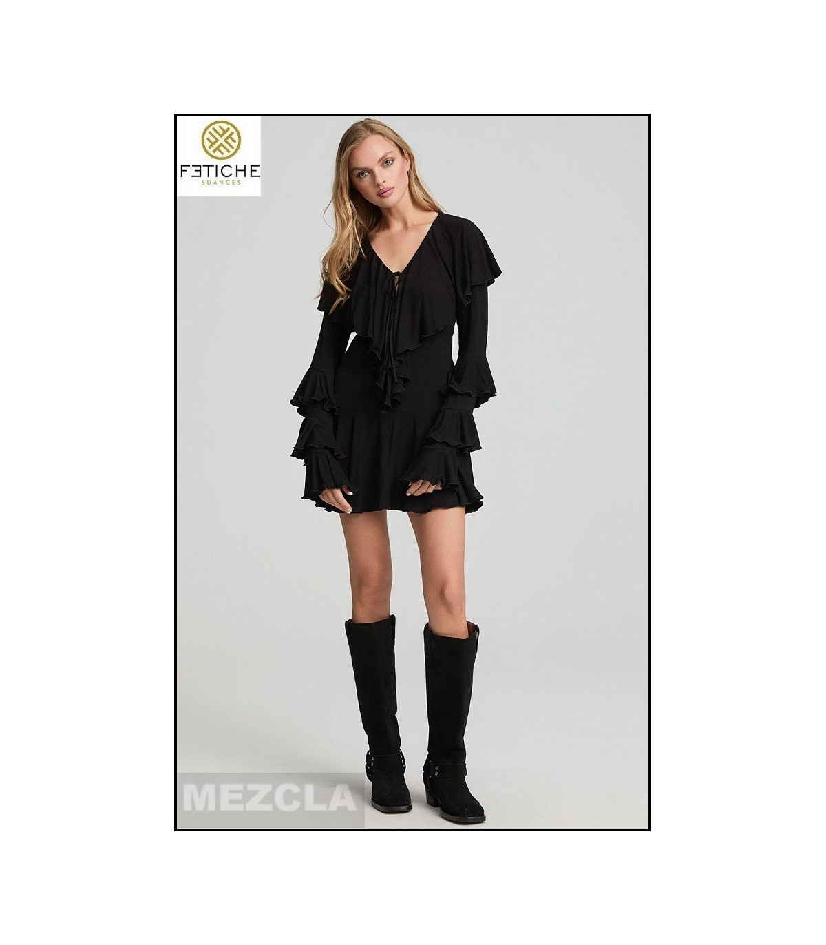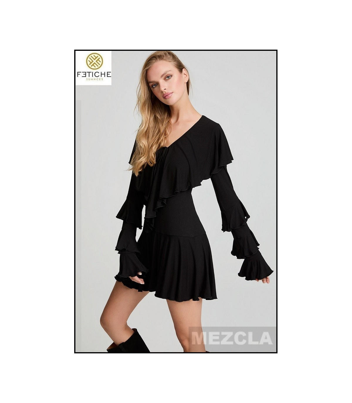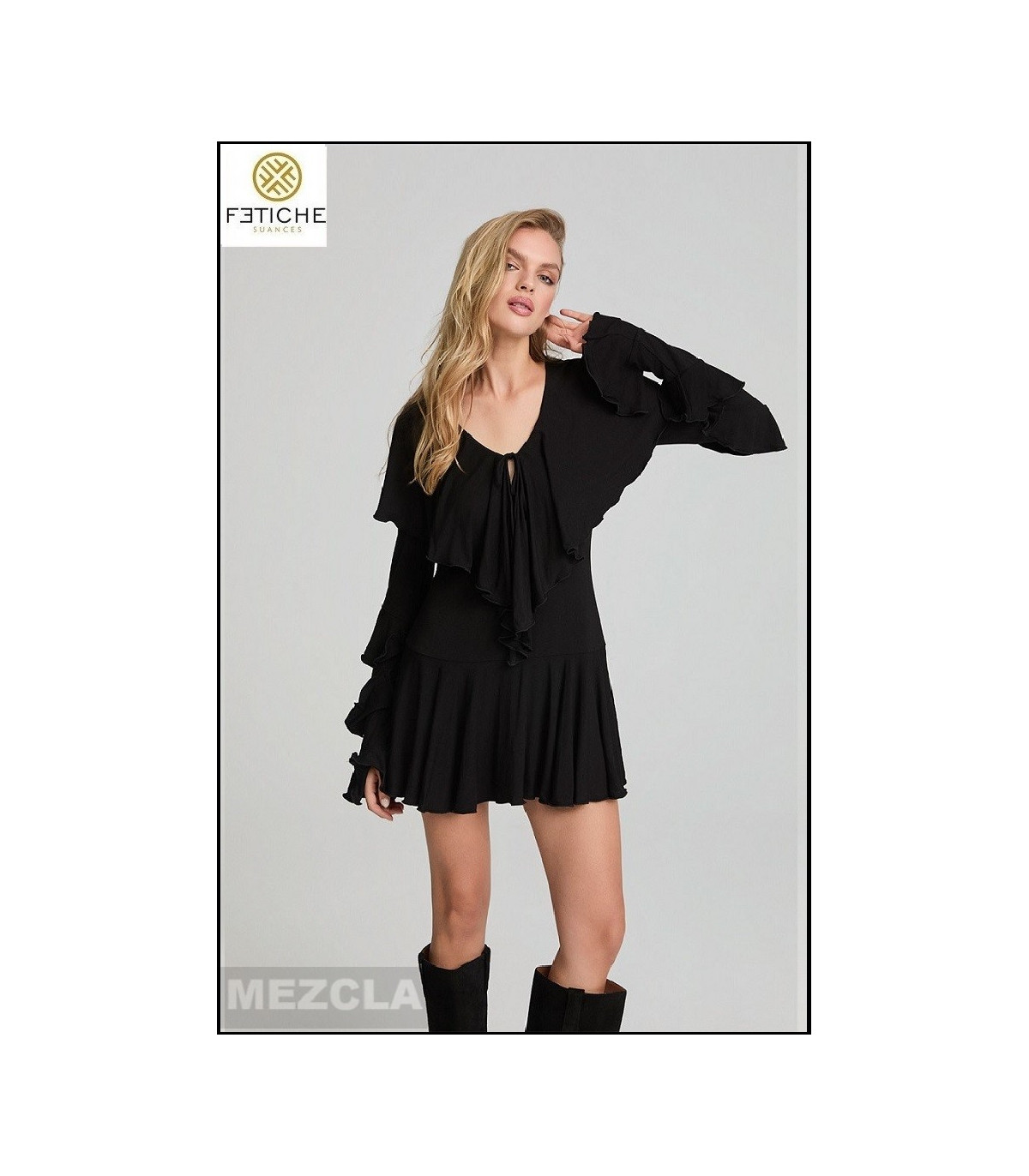 La parte de arriba, con escote en pico y volantes que enmarcan los hombros y las mangas, realza la silueta con un aire femenino y sofisticado. La parte de la falda, corta y fluida, acompaña cada paso con ligereza y dinamismo, creando un look tan cómodo como seductor.