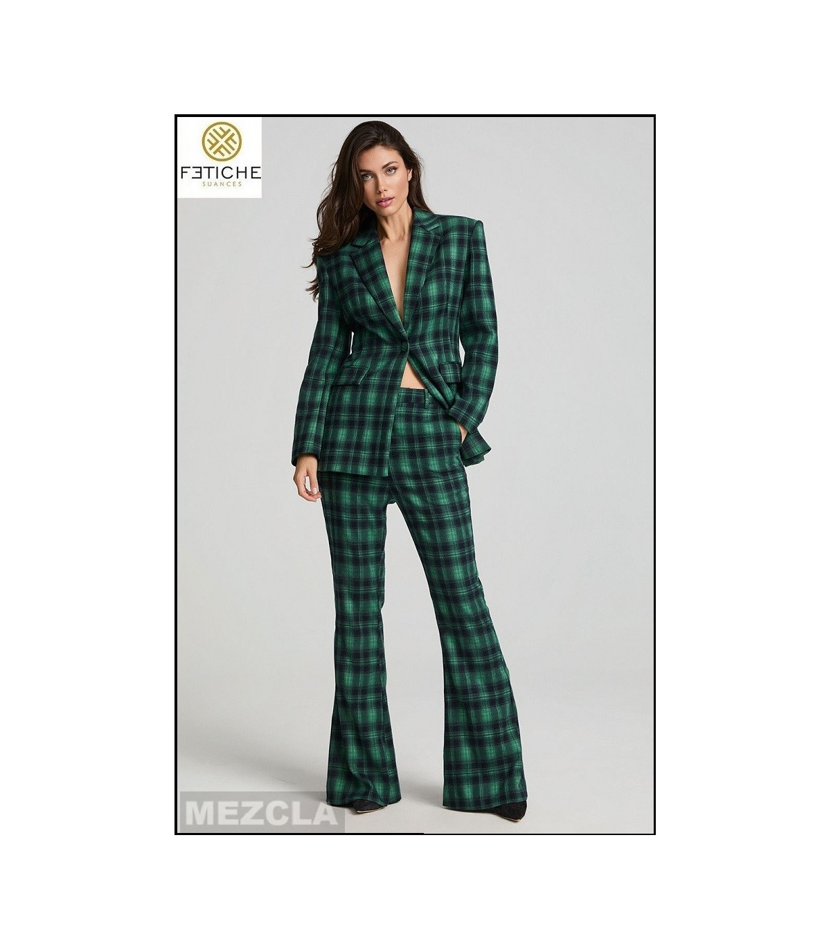 La americana, de corte estructurado y hombros marcados, estiliza la figura con elegancia y fuerza. El pantalón de campana realza las piernas y aporta movimiento, creando un equilibrio perfecto entre feminidad y carácter.