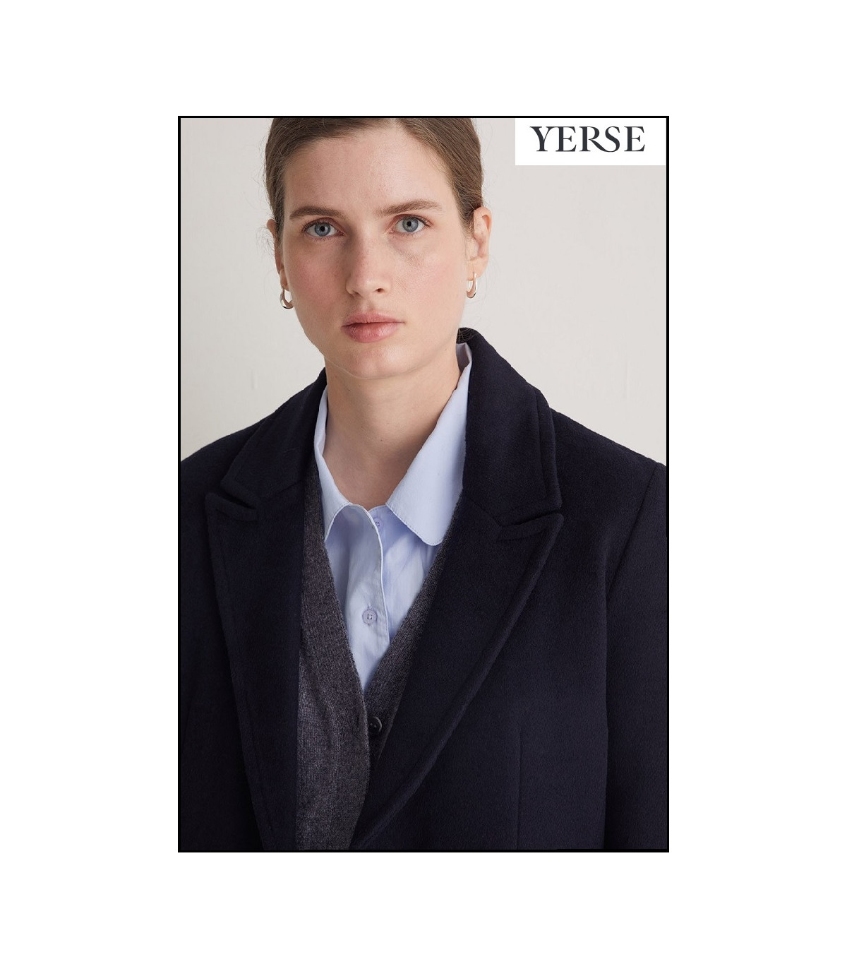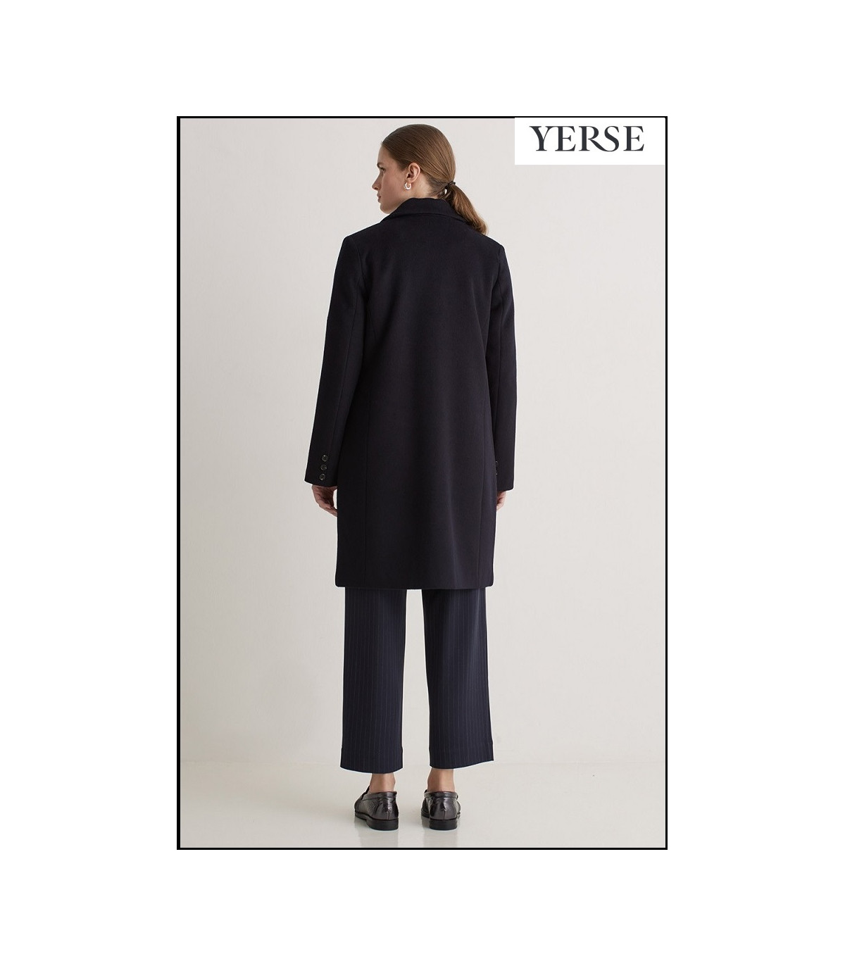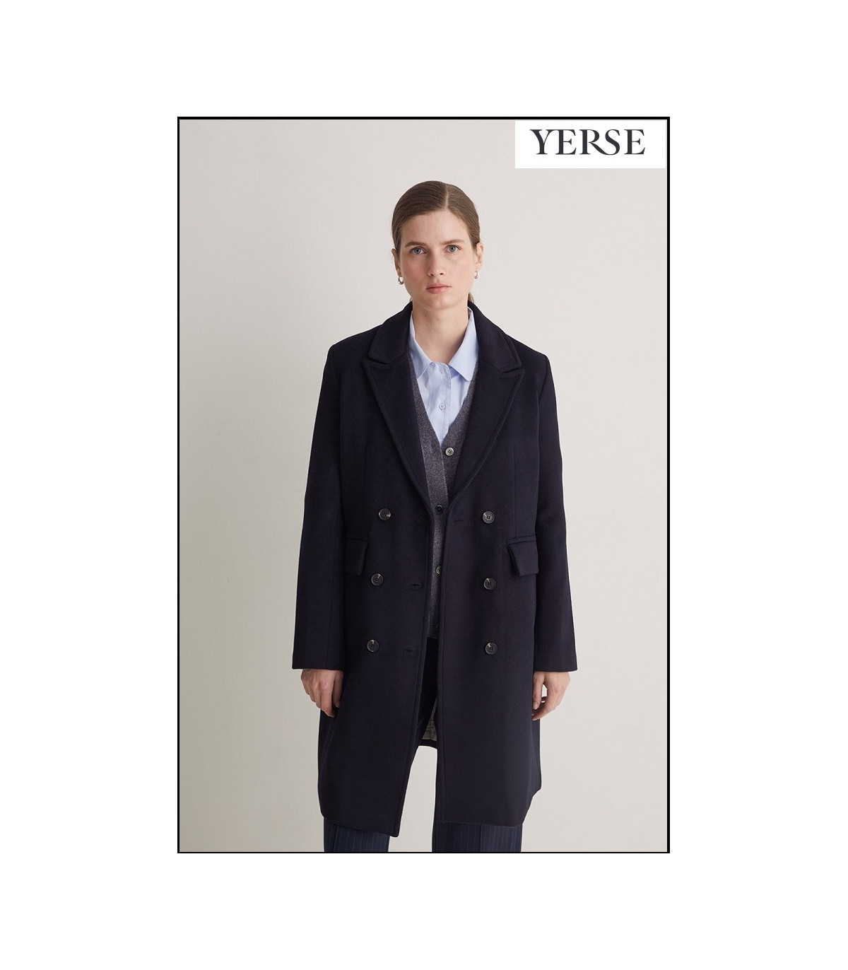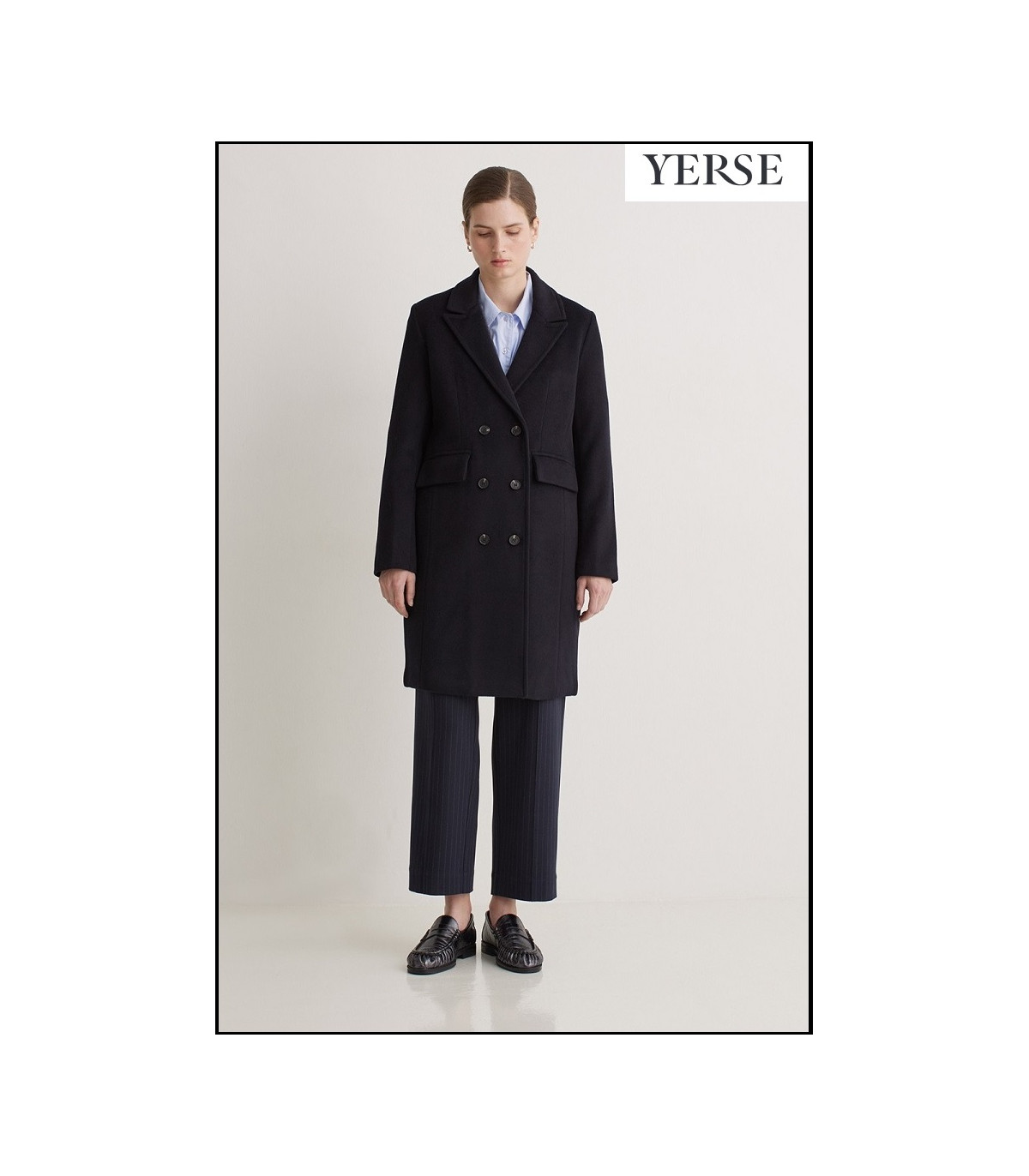 Abrigo cruzado. Tejido cheviot mezcla de lana. Con forro interior. Diseño ceñido. Cuello pico con solapa. Manga larga. Detalle 3 botones en puños. Cierre con doble botonadura. Bolsillos frontales con solapa.
