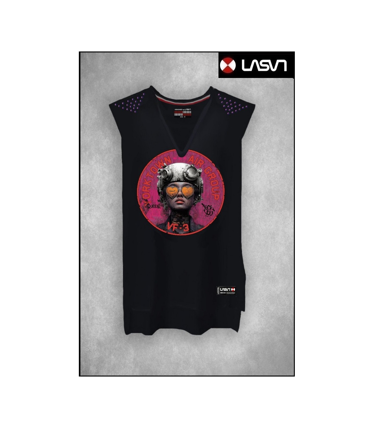 Aplicaciones exclusivas del modelo en los hombros.- Cuello pico, sin mangas. - 100% algodón de 180gr. - Estampación delantera digital. - Numeración de Edición Limitada en la espalda. - Logo engomado de la firma cosido en la prenda. - Parte trasera más larga que la delantera.